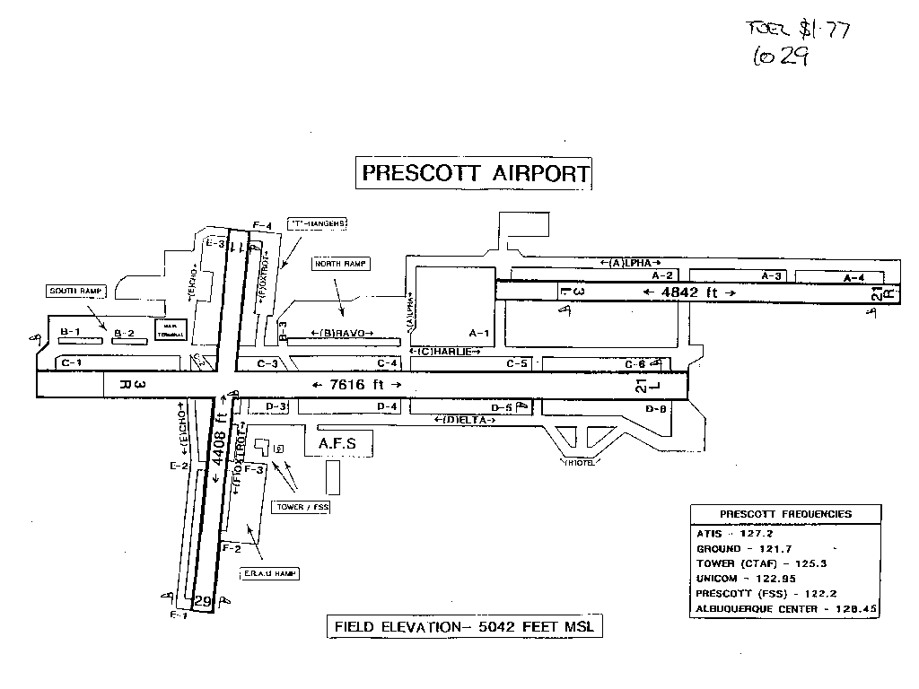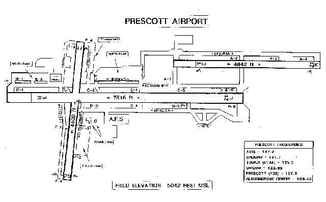 The city of Prescott, Arizona, has a magnificent general aviation airport situated about 5 mi N of the town. The field is the home of Embry-Riddle aeronautical university and I have heard it said that Prescott is the 7th busiest airport in the US, based on the number of departures! There are several FBO's at Prescott including North-Aire, whose aircraft I rent from time to time. Despite the intensive training traffic and scheduled departures to Phoenix, Prescott is an excellent base. Central Arizona enjoys excellent year round weather and the field elevation of 5042' means that the climate at Prescott is pleasantly cool. However, the elevation also means that aircraft are covered in ice on winter mornings and in need of most of Prescott's 7616' takeoff distance in summer!